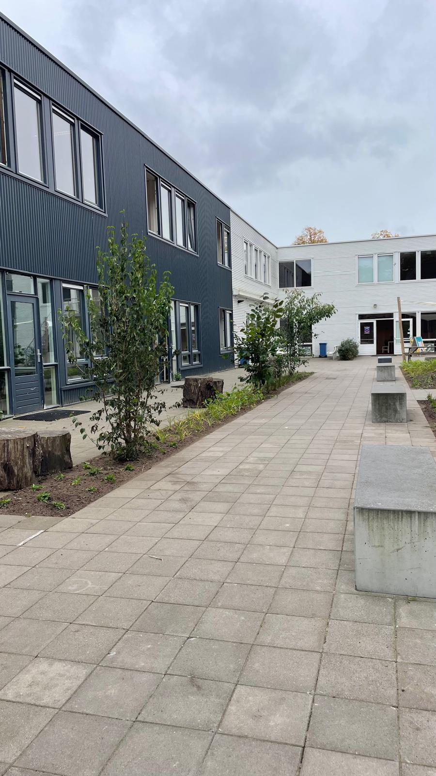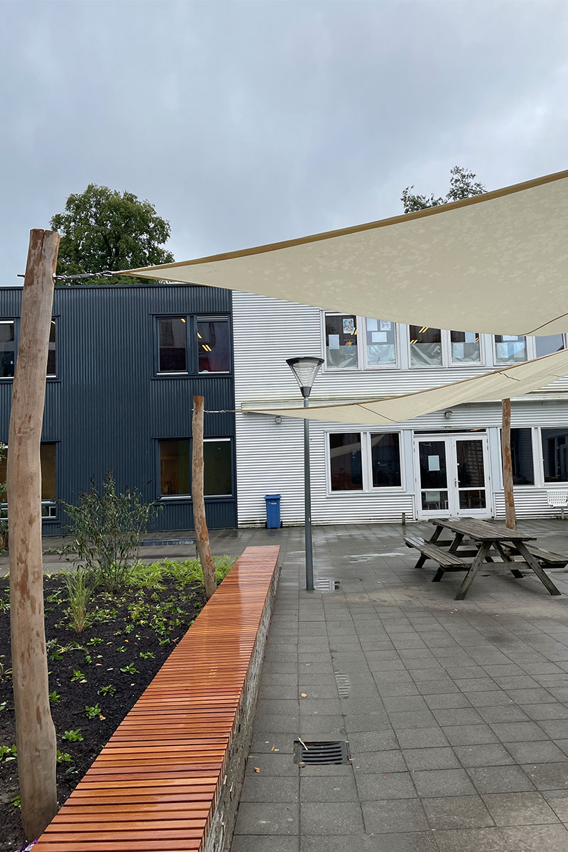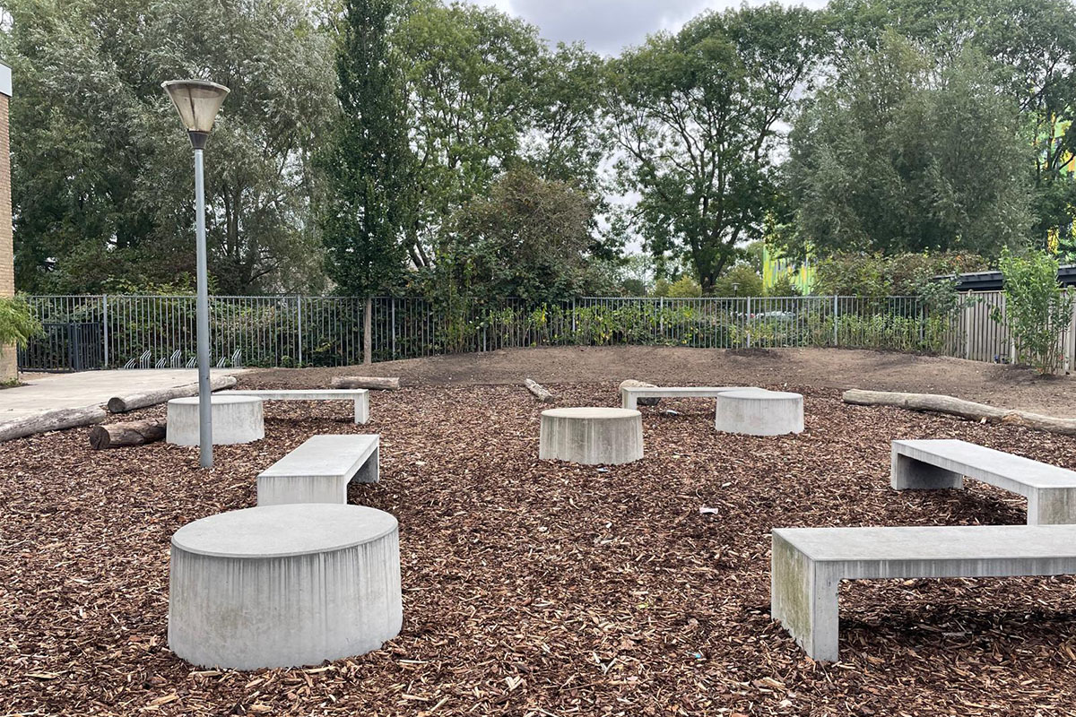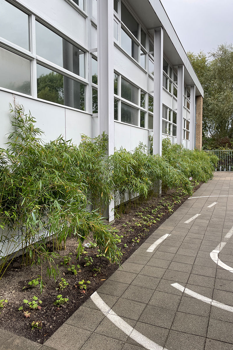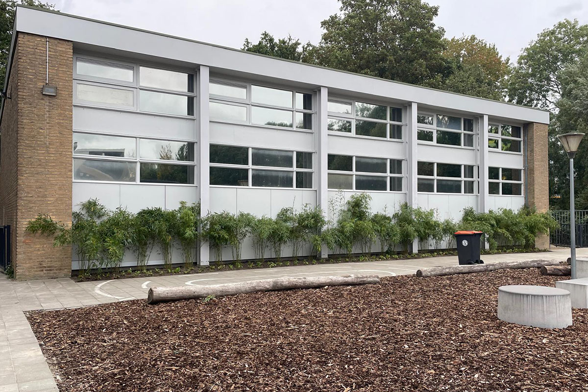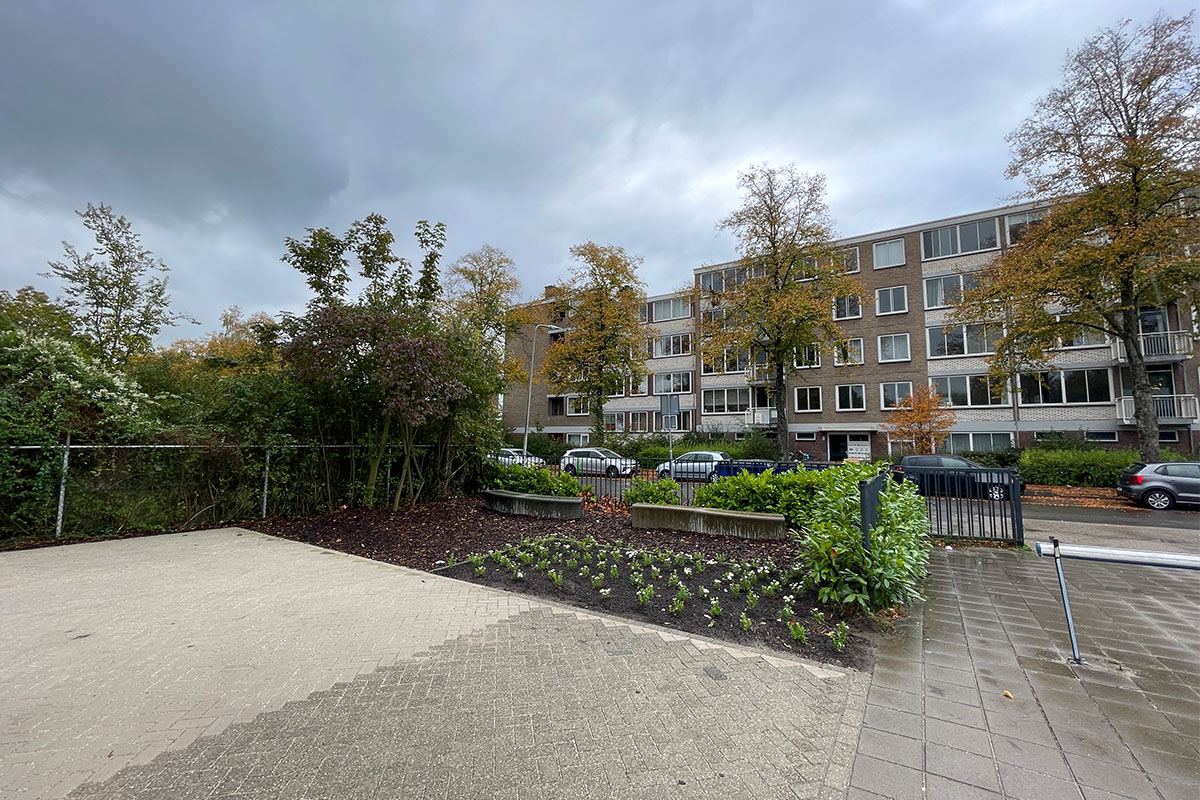 De wens vanuit de school voor (veel) meer groen was groot. Zodoende zijn de schoolpleinen van een stenige massa veranderd naar schoolpleinen met diverse, maar eenduidige uitstraling met een variëteit van beplanting. De vrijgekomen betontegels voor de groenaanleg zijn hergebruikt voor het maken van een lange bank waarop gepauzeerd kan worden. Ook de boomstammen en de betonbankjes zijn opnieuw gepositioneerd in het plan, te midden van het groen en hebben daarmee een compleet andere uitstraling gekregen. De school is blij met de vergroening en kijkt uit naar de komende jaren als de beplanting verder gaat groeien en (op)bloeien.